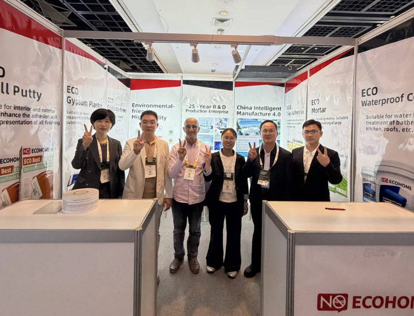 展会现场,生态家园的展位前始终人头攒动。本次带来的七大系列产品,全面覆盖内墙装修从基础处理到成品涂装的全流程,形成了完整的产品生态闭环。其中,腻子粉、找平石膏、瓷砖胶、防水涂料、白乳胶等经典主力产品,凭借稳定的性能与广泛的适用性,成为现场咨询量最高的“明星单品”。众多来自中东、非洲及南亚地区的建筑承包商、设计师在亲身体验产品样板后,对其施工便捷性与耐用性赞不绝口。