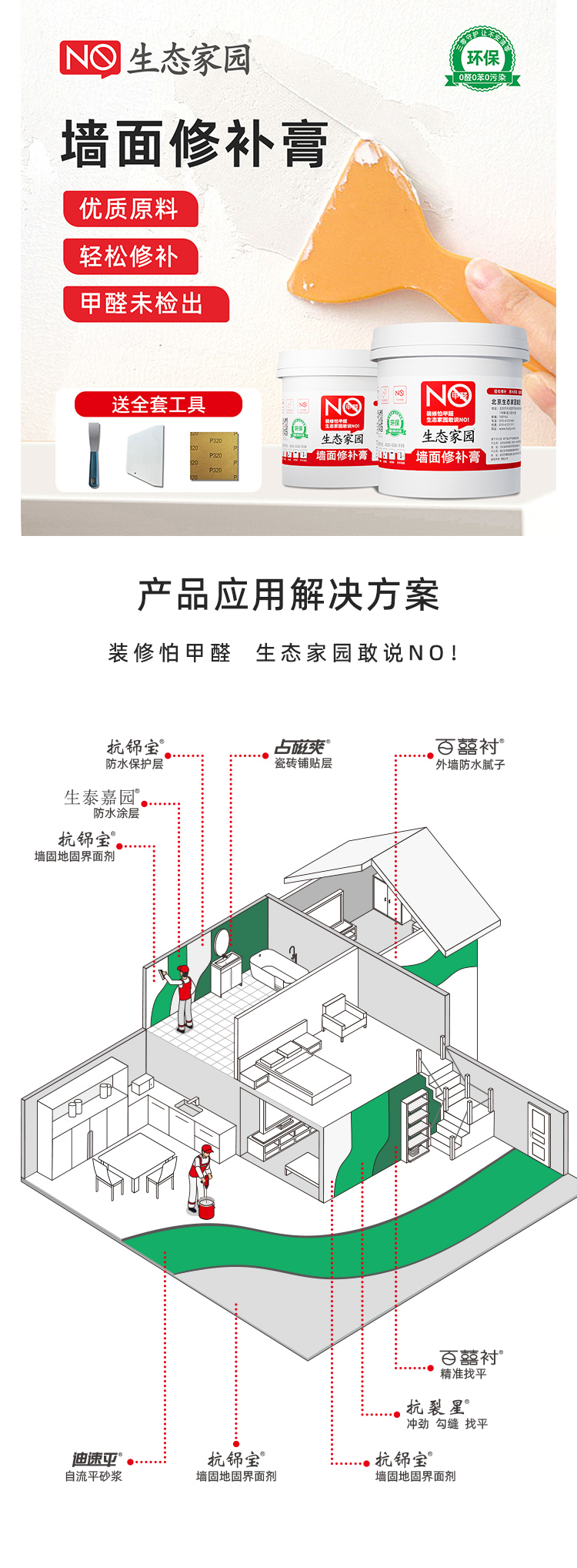 墙面修补膏采用全新水性环保配方,使用优质原料,结合先进工艺生产而成,新一代环保型底材处理产品。具有良好的防霉耐水功效,用于修补墙面出现的钉眼、小范围的开裂、孔洞、刮痕、起皮等墙面问题,具有环保健康、0级防霉、耐水性好、附着力强、无须加水,施工方便等优点。本品开盖即用,批刮后与基层结合牢固,附着力强,细腻平滑,装饰性好。本品适用于室内墙面乳胶漆涂刷之前的基层平整处理。