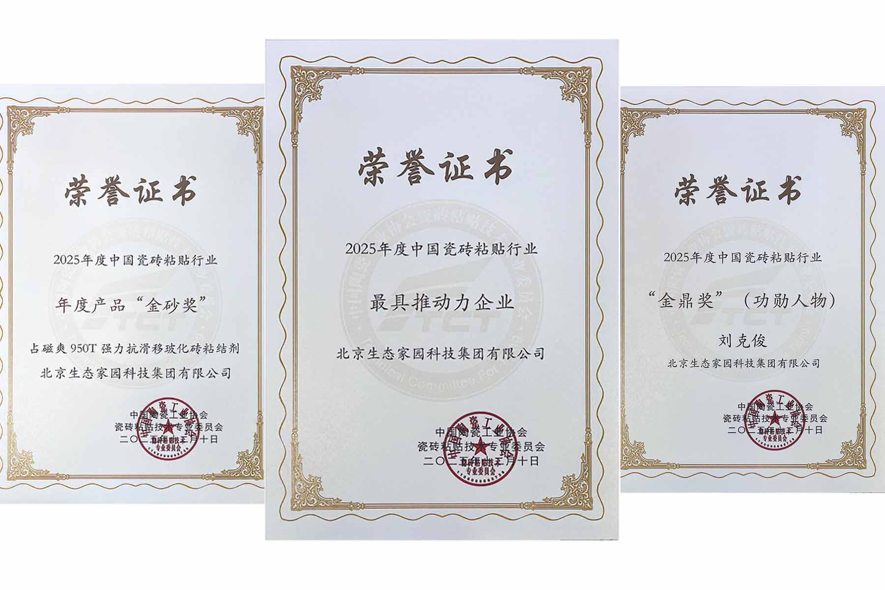 会上,北京生态家园科技集团有限公司凭借在技术研发、产品创新、行业推动等方面的卓越表现,一举斩获“最具推动力企业”大奖;旗下核心产品占磁爽950T瓷砖胶荣膺年度产品“金砂奖”;集团董事长刘克俊先生荣获“金鼎奖”功勋人物称号,多项荣誉加身,彰显了行业对生态家园集团综合实力的高度认可。