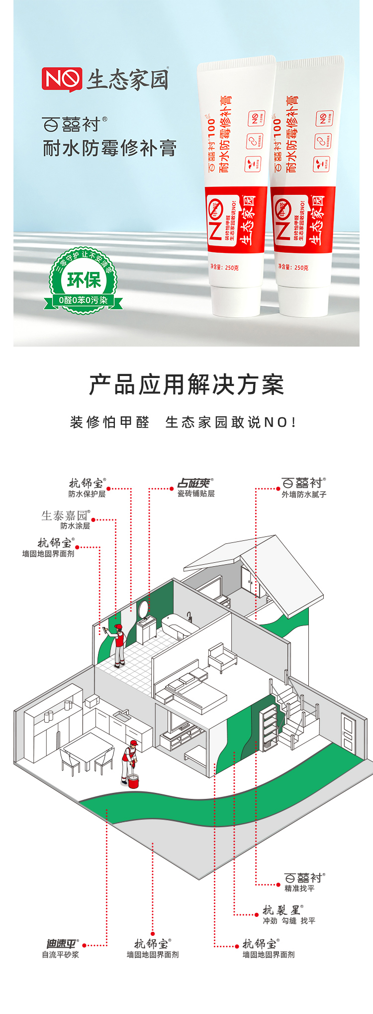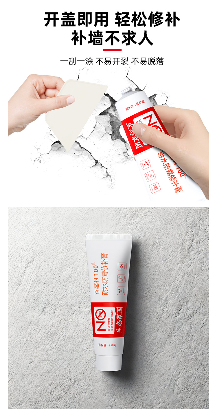 墙面耐水防霉修补膏采用全新水性环保配方,使用优质原料,结合先进工艺生产而成,新一代环保型底材处理产品。具有良好的防霉耐水功效,用于修补墙面出现的钉眼、小范围的开裂、孔洞、刮痕、起皮等墙面问题,具有环保健康、0级防霉、耐水性好、附着力强、无须加水,施工方便等优点。本品开盖即用,批刮后与基层结合牢固,附着力强,细腻平滑,装饰性好。本品适用于室内墙面乳胶漆涂刷之前的基层平整处理。