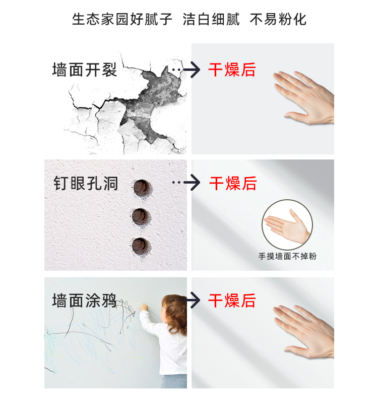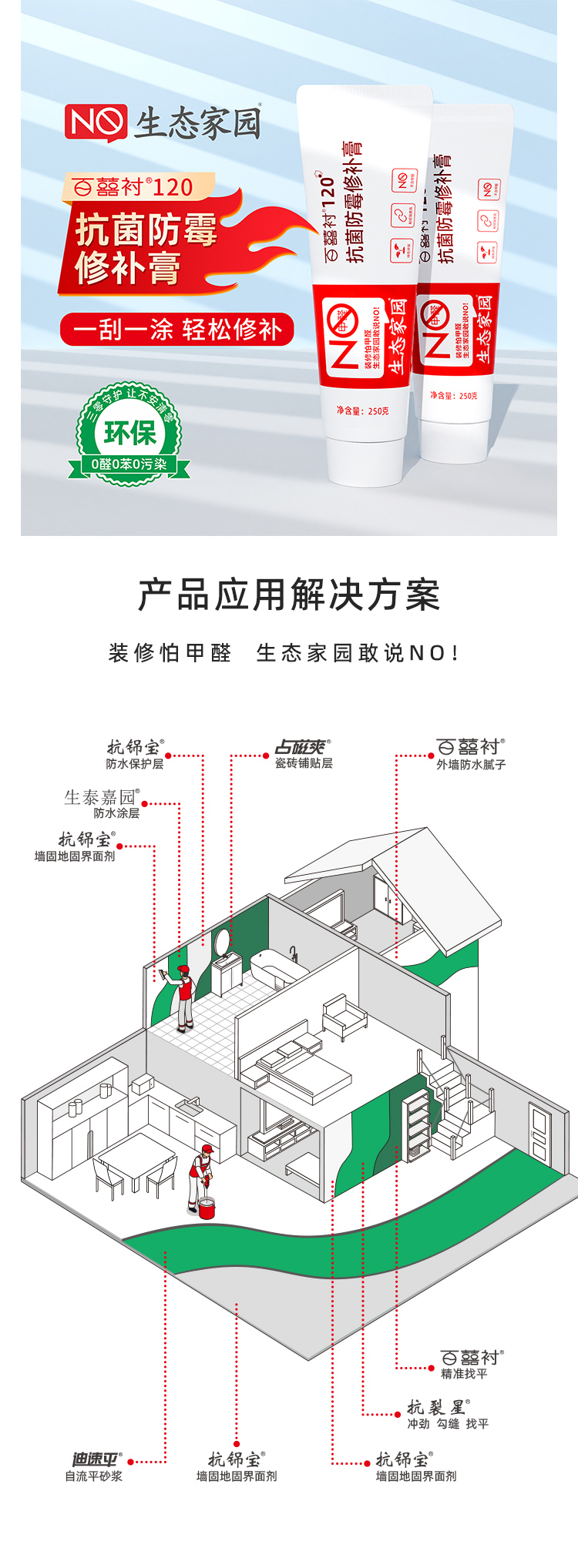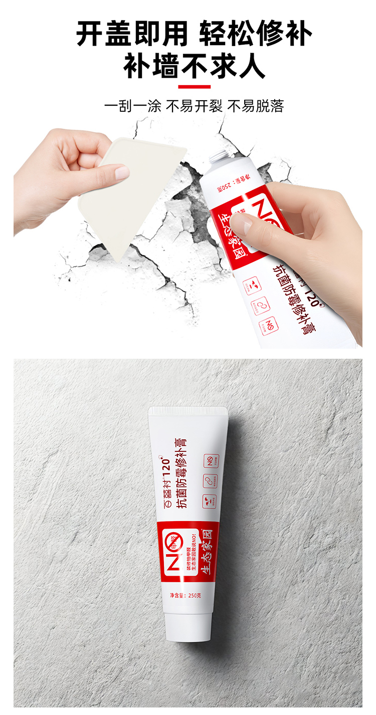 墙面抗菌防霉修补膏采用全新水性环保配方,使用优质原料,结合先进工艺生产而成,新一代环保型底材处理产品。具有良好的防霉耐水功效,用于修补墙面出现的钉眼、小范围的开裂、孔洞、刮痕、起皮等墙面问题,具有环保健康、0级防霉、耐水性好、附着力强、无须加水,施工方便等优点。本品开盖即用,批刮后与基层结合牢固,附着力强,细腻平滑,装饰性好。本品适用于室内墙面乳胶漆涂刷之前的基层平整处理。