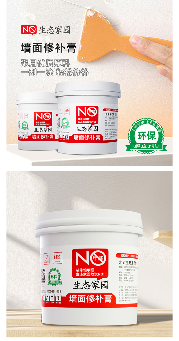 墙面修补膏采用全新水性环保配方,使用优质原料,结合先进工艺生产而成,新一代环保型底材处理产品。具有良好的防霉耐水功效,用于修补墙面出现的钉眼、小范围的开裂、孔洞、刮痕、起皮等墙面问题,具有环保健康、0级防霉、耐水性好、附着力强、无须加水,施工方便等优点。本品开盖即用,批刮后与基层结合牢固,附着力强,细腻平滑,装饰性好。本品适用于室内墙面乳胶漆涂刷之前的基层平整处理。